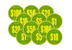(2) $5, (2) $10, (2) $20, (2) $50, (2) $100 denominations. Latex-free. Set contains 12 molded vinyl spots, each measuring 8½" dia. x